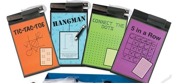 These game pad and pen sets each include four different games to play: Hangman, Connect the Dots, Tic-Tac-Toe, and 5 in a Row. Great for quiet playtime at home, or for travel fun!