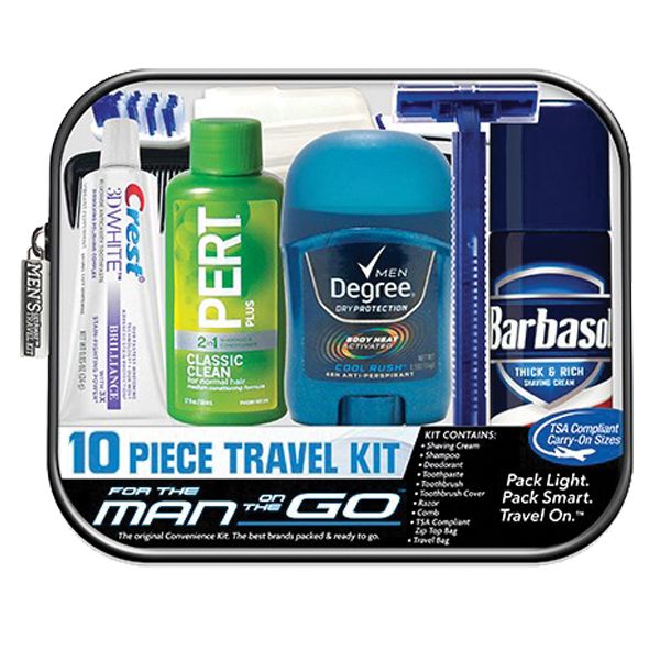 This 10-piece travel kit is perfect for the man on the go! Each kit comes in a reusable bag with zip closure. Bag includes a men's razor, shaving cream, a toothbrush, toothbrush cover, toothpaste, shampoo, deodorant, comb, and TSA-compliant zip-top bag. Bag and contents meet TSA standards.