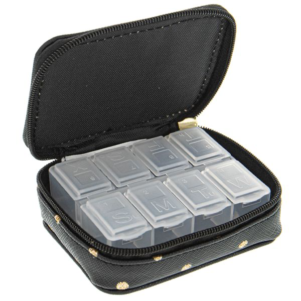The perfect travel companion for your medications, supplements and vitamins, this pill case offers seven labeled compartments (for each day of the week), plus a bonus compartment.