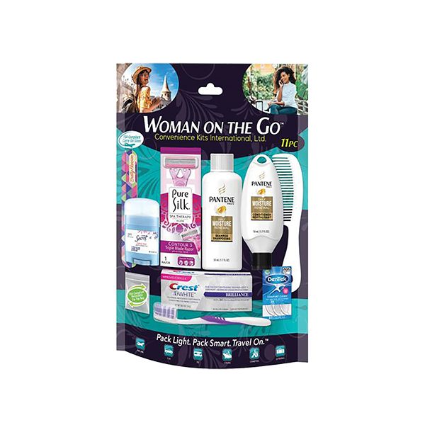 This women's 11-piece travel kit is perfect for on the go personal care! Each kit comes in a re-closeable foil bag. Bag includes shampoo, conditioner, razor, deodorant, toothpaste, toothbrush, toothbrush cover, flossers, styling comb, nail file and quart-size zip-top bag. Bag and contents meet TSA standards.